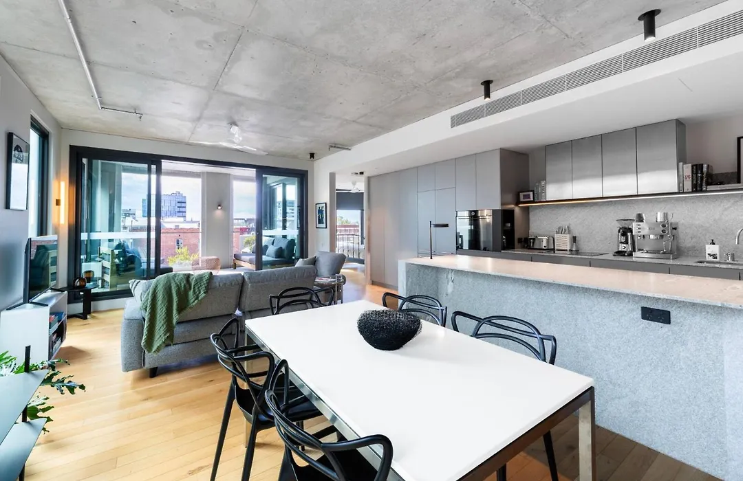 Hemingway Collingwood - Luxe Apartment W Parkingの設備の整った台所の便利さを楽しみ、自家製の食事を用意できます。 最寄りのバス停Napier Street/Johnston Streetは200メートルほどの距離にあります。